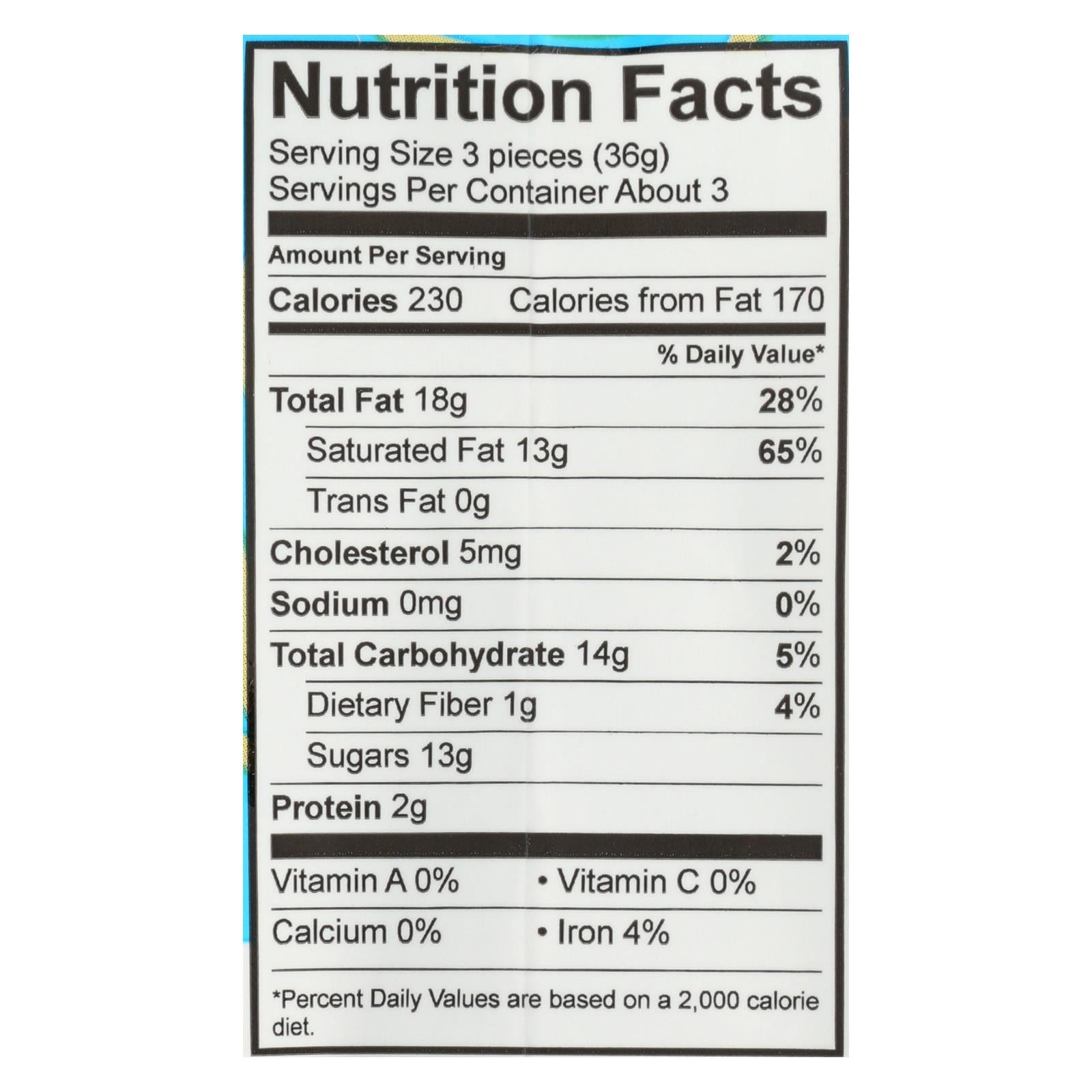 ingredients : organic raw cane sugar;organic cocoa butter;organic whole milk;organic coconut oil;organic cacao beans;natural flavors;organic vanilla beans