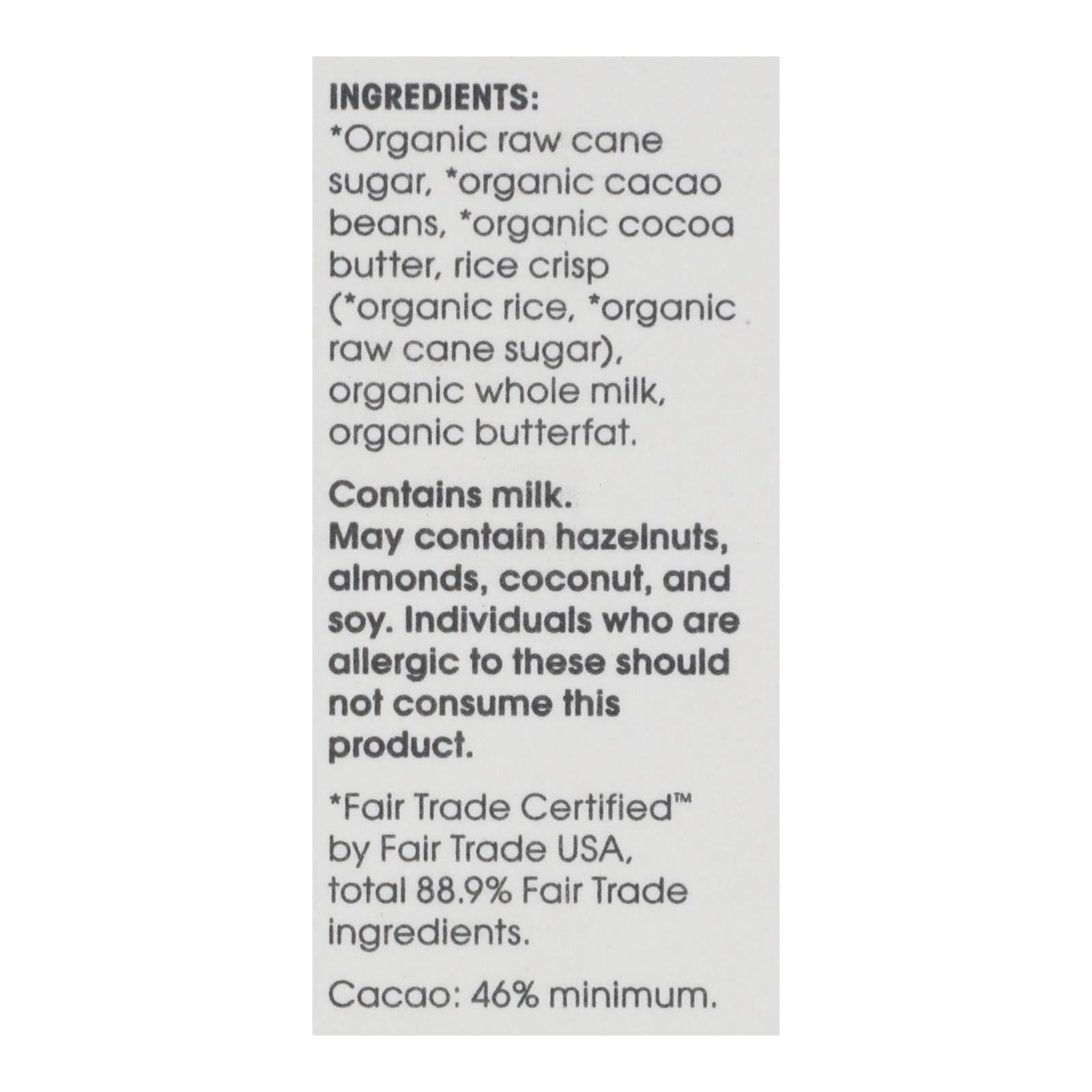 ingredients : organic raw cane sugar;organic cacao beans;organic cocoa butter;rice crisp (*organic rice, *organic raw cane sugar);organic whole milk;organic butterfat