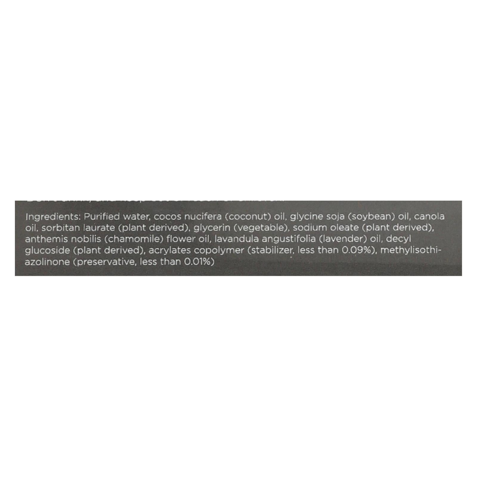 ingredients : purified water;cocos nucifera;coconut;oil;glycine soja;soybean;canola oil;sorbitan laurate;plant derived;glycerin;vegetable;sodium oleate;anthemis nobilis;chamomile;flower oil;lavandula angustifolia;lavender;decyl glucoside;acrylates copolymer;stabilizer;less than 0.09%;methylisothiazolinone;preservative;less than 0.01%