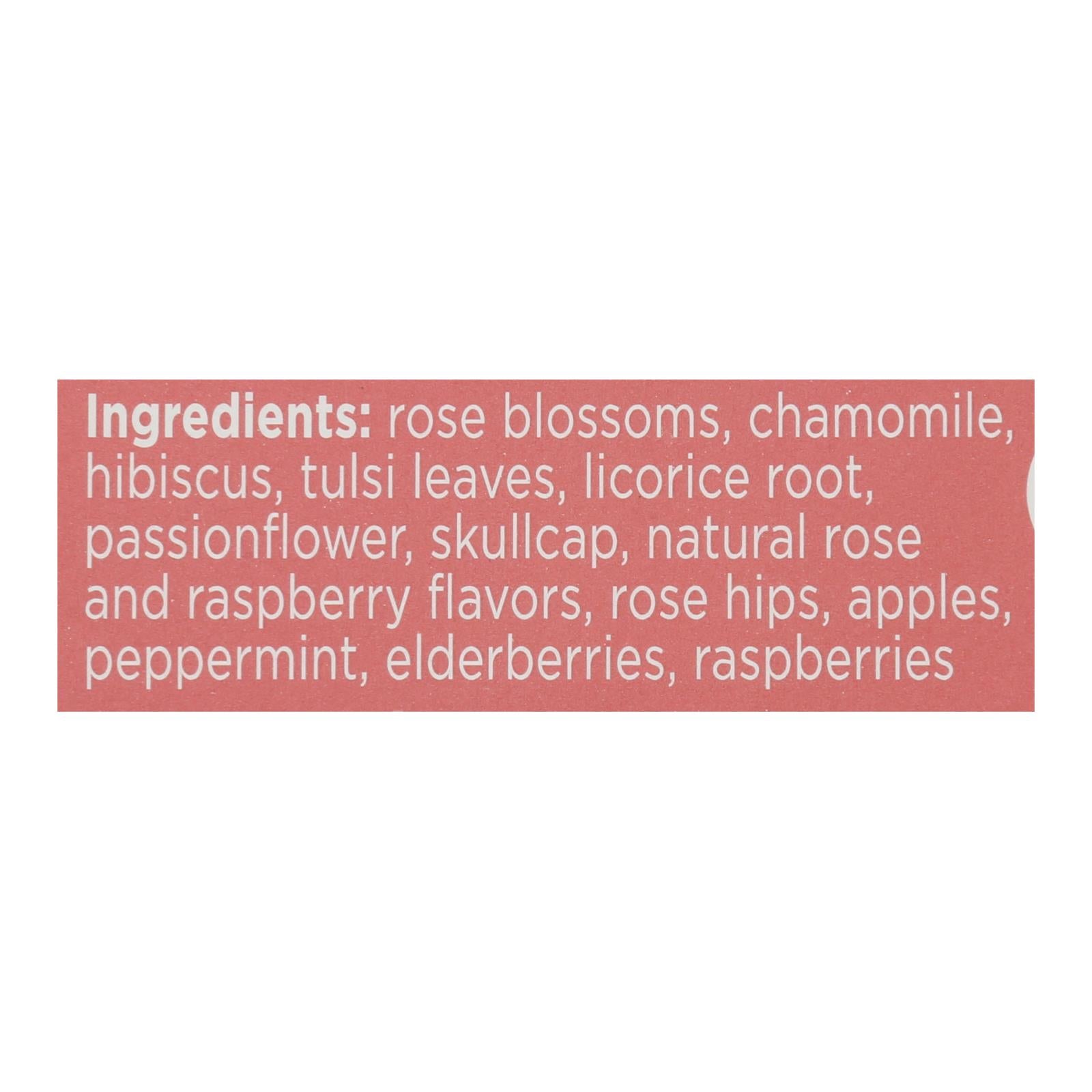 ingredients : rose blossoms;chamomile;hibiscus;tulsi leaves;licorice root;passionflower;skullcap;natural rose and raspberry flavors;rose hips;apples;peppermint;elderberries;raspberries