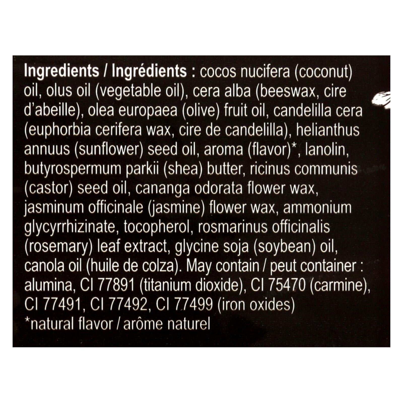 ingredients : cocos nucifera (coconut) oil;olus [vegetable] oil;cera alba [beeswax), olea europaea (olive) fruit oil, candelilla cera [euphorbia cerifera (candelilla) wax], helianthus annuus (sunflower) seed oil, aroma [flavor]*, lanolin, butyrospermum parkii (shea) butter, ricinus communis (castor) seed oil, ammonium glycyrrhizate, tocopherol, rosmarinus officinalis (rosemary) leaf extract, glycine soja (soybean) oil, canola oil, alumina