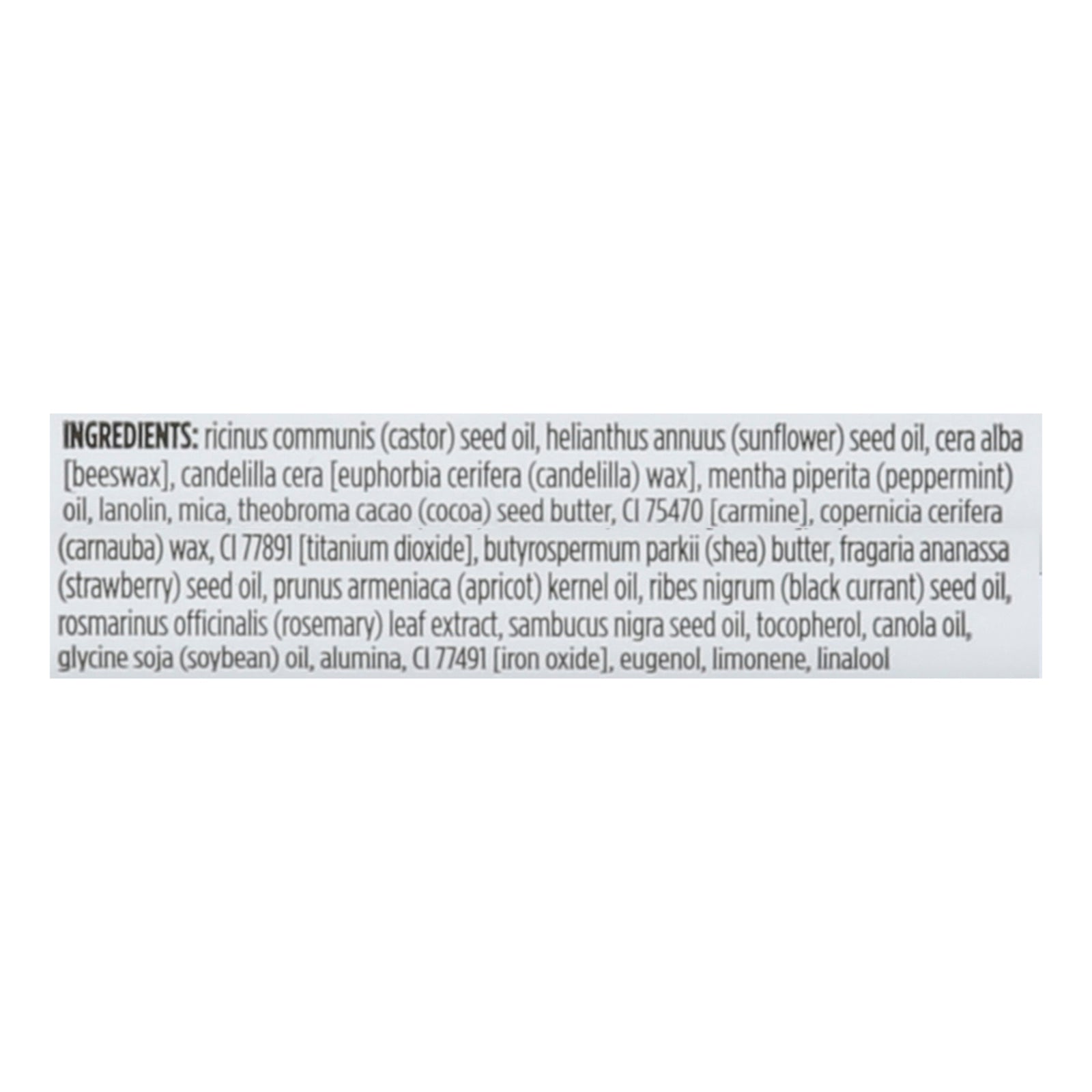 ingredients : ricinus communis (castor) seed oil;helianthus annuus (sunflower) seed oil;cera alba [beeswax];candelilla cera [euphorbia cerifera (candelilla) wax];mentha piperita (peppermint) oil;lanolin;mica;theobroma cacao (cocoa) seed butter;cl 75470 [carmine];copernicia cerifera (carnauba) wax;cl 77891 [titanium dioxide];butyrospermum parkii (shea) butter;fragaria ananassa (strawberry) seed oil;prunus armeniaca (apricot) kernel oil;ribes nigrum (black currant) seed oil;rosmarinus officinalis (rosemary) lea
