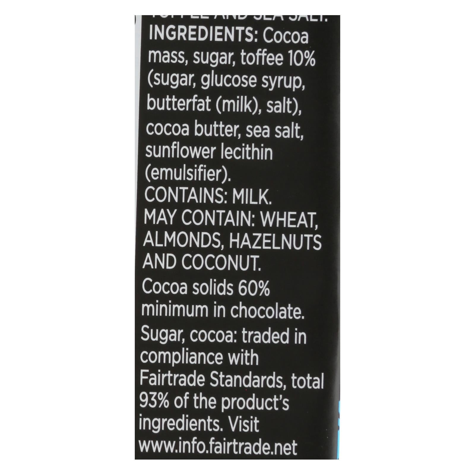 ingredients : cocoa mass;sugar;caramel crisp 10% (sugar, glucose syrup, butterfat (milk), salt);cocoa butter;sea salt;sunflower lecithin
