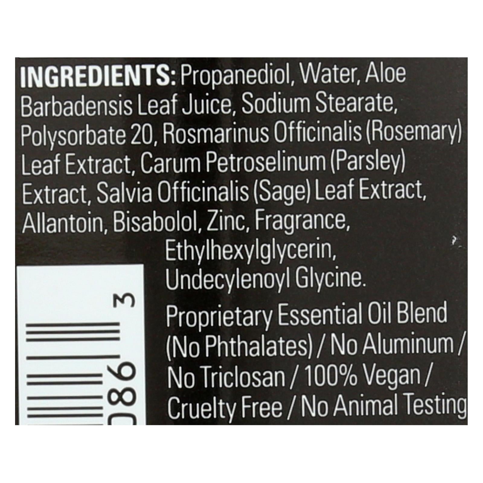 ingredients : propanediol;water;aloe barbadensis leaf juice;sodium stearate;polysorbate 20;rosmarinus officinalis;rosemary;leaf extract;carum petroselinum;parsley;extract;salvia officinalis;sage;allantoin;bisabolol;zinc;fragrance;ethylhexyglycerin;undecylenoyl glycine