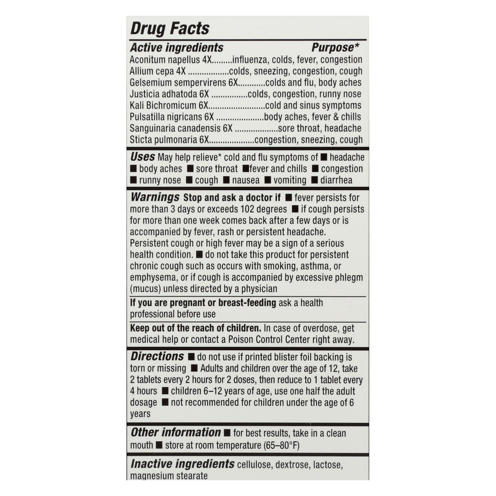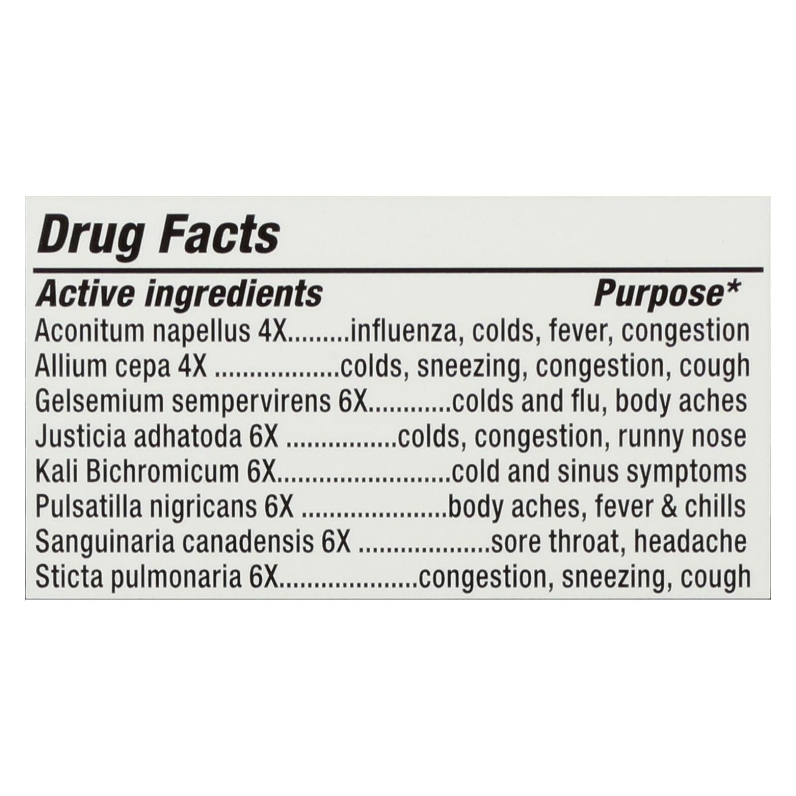 ingredients : aconitum napellus 4x purpose influenza;colds;fever;congestion allium cepa 4x purpose colds;sneezing;congestion;cough gelsemium sempervirens 6x purpose colds and flu;body aches justicia adhatoda 6x purpose colds;runny nose kali bichromicum 6x purpose cold and sinus symptoms pulsatilla nigricans 6x purpose body aches;fever & chills sanguinaria canadensis 6x purpose sore throat;headache sticta pulmonaria 6x purpose congestion;cough;cellulose;dextrose;lactose;magnesium stearate