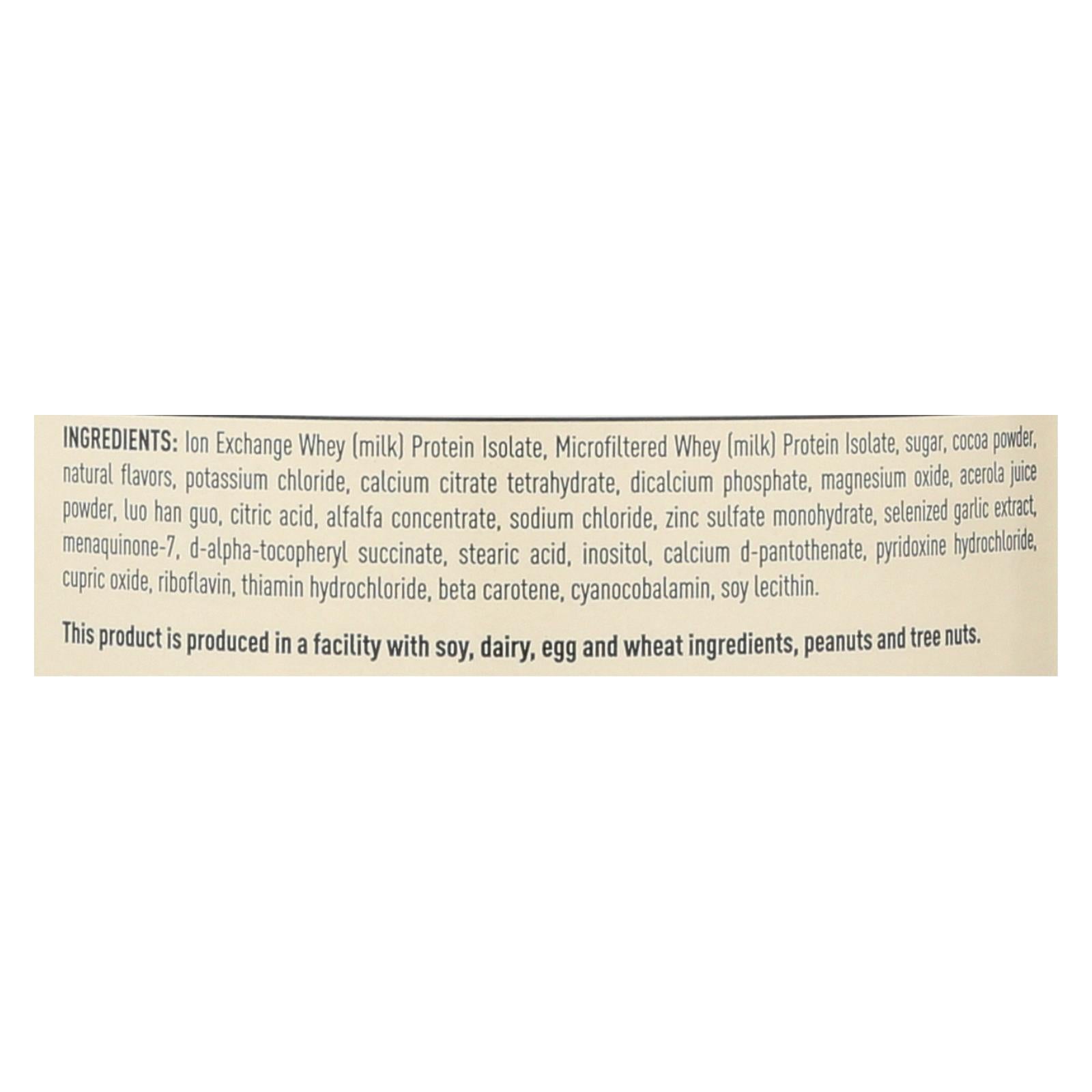 ingredients : ion exchange whey;milk;protein isolate;microfiltered whey;sugar;cocoa powder;natural flavors;potassium chloride;calcium citrate tetrahydrate;dicalcium phosphate;magnesium oxide;acerola juice powder;luo han guo;citric acid;alfalfa concentrate;sodium chloride;zinc sulfate monohydrate;selenized garlic extract;menaquinone-7;d-alpha tocopheryl succinate;stearic acid;inositol;calcium d-pantothenate;pyridoxine hydrochloride;cupric oxide;riboflavin;thiamin hydrochloride;beta carotene;cyanocobalamin;soy