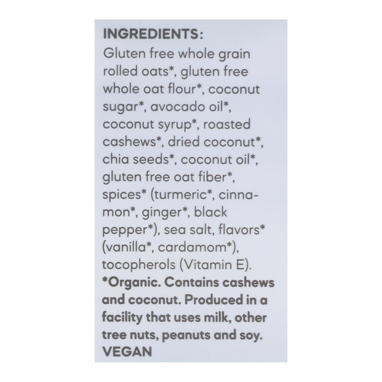ingredients : gluten free whole grain rolled oats;gluten free whole oat flour;coconut sugar;avocado oil;coconut syrup;roasted cashews;dried coconut;chia seeds;coconut oil;gluten free oat fiber;spices* (turmeric*, cinnamon*, ginger*, black pepper*);sea salt;flavors* (vanilla*, cardamom*);tocopherols (vitamin e)