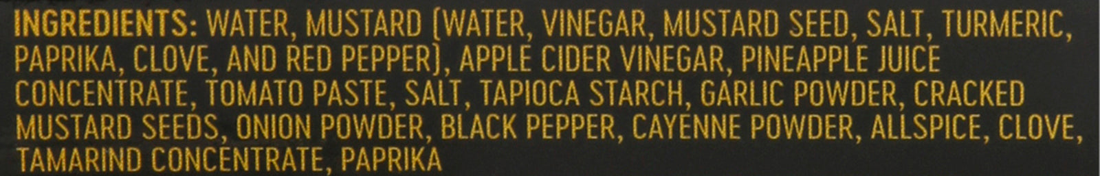 ingredients : water;mustard (water, vinegar, mustard seed, salt, turmeric, paprika, clove, red pepper);apple cider vinegar;pineapple juice concentrate;tomato paste;salt;tapioca starch;garlic powder;cracked mustard seeds;onion powder;black pepper;tamarind concentrate;paprika;cayenne powder;allspice;clove
