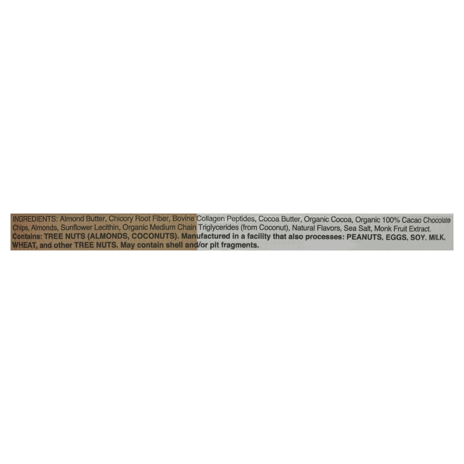 ingredients : almonds;inulin;soy protein crisp;protein blend (pea protein, almond protein powder);dark chocolate chips (organic cane sugar, organic chocolate liquor, organic cocoa butter, organic vanilla powder);cocoa butter;allulose;cocoa powder;mct powder;soy lecithin;natural flavors;sea salt;monk fruit