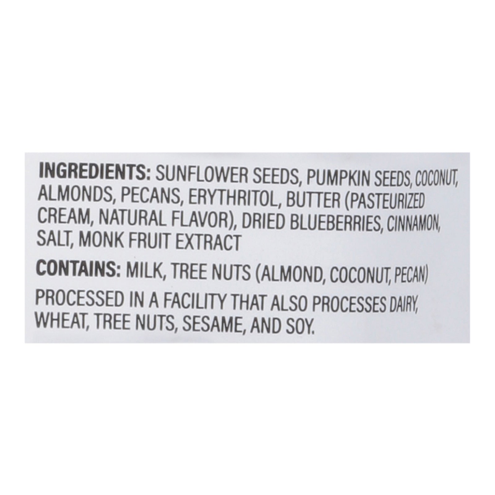 ingredients : sunflower seeds;pumpkin seeds;coconut;almonds;pecans;erythritol;butter (pasteurized cream, natural flavor);dried blueberries;cinnamon;salt;monk fruit extract