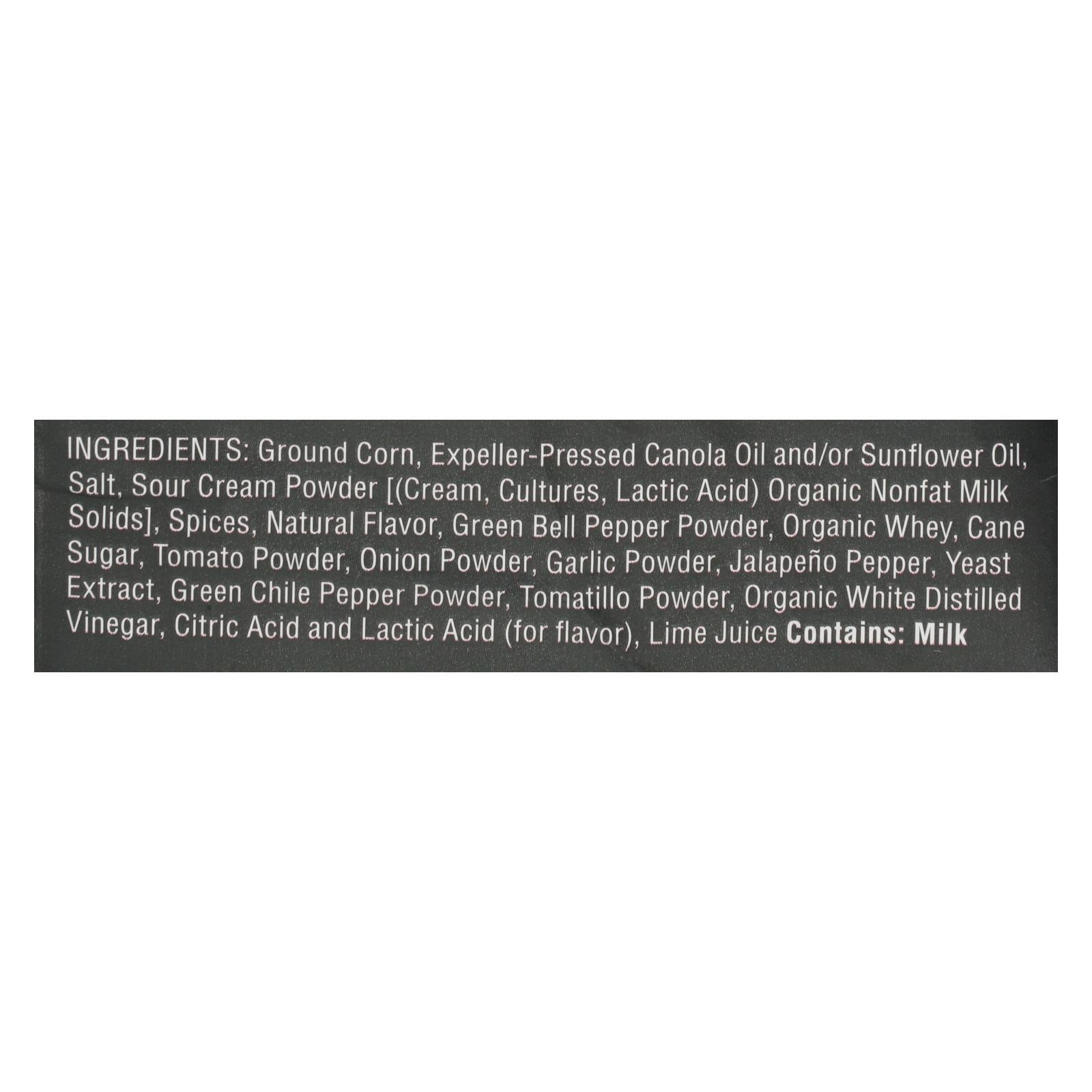 ingredients : ground corn;expeller-pressed canola oil and/or sunflower oil;salt;sour cream powder [;cream;cultures;lactic acid;organic nonfat milk solids];spices;natural flavor;green bell pepper powder;organic whey;cane sugar;tomato powder;onion powder;garlic powder;jalapeno pepper;yeast extract;green chile pepper powder;tomatillo powder;organic white distilled vinegar;citric acid and lactic acid;for flavor;lime juice