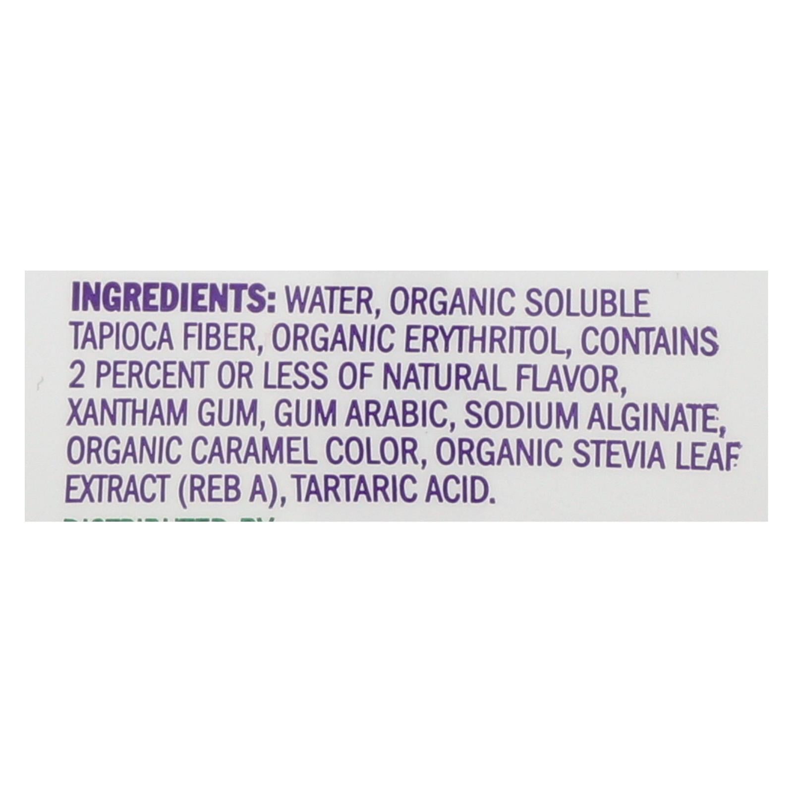 ingredients : water;organic soluble tapioca fiber;organic erythritol;contains 2 percent or less of organic natural flavors;organic caramel color;xanthan gum;organic stevia leaf extract;tartaric acid;organic gum arabic