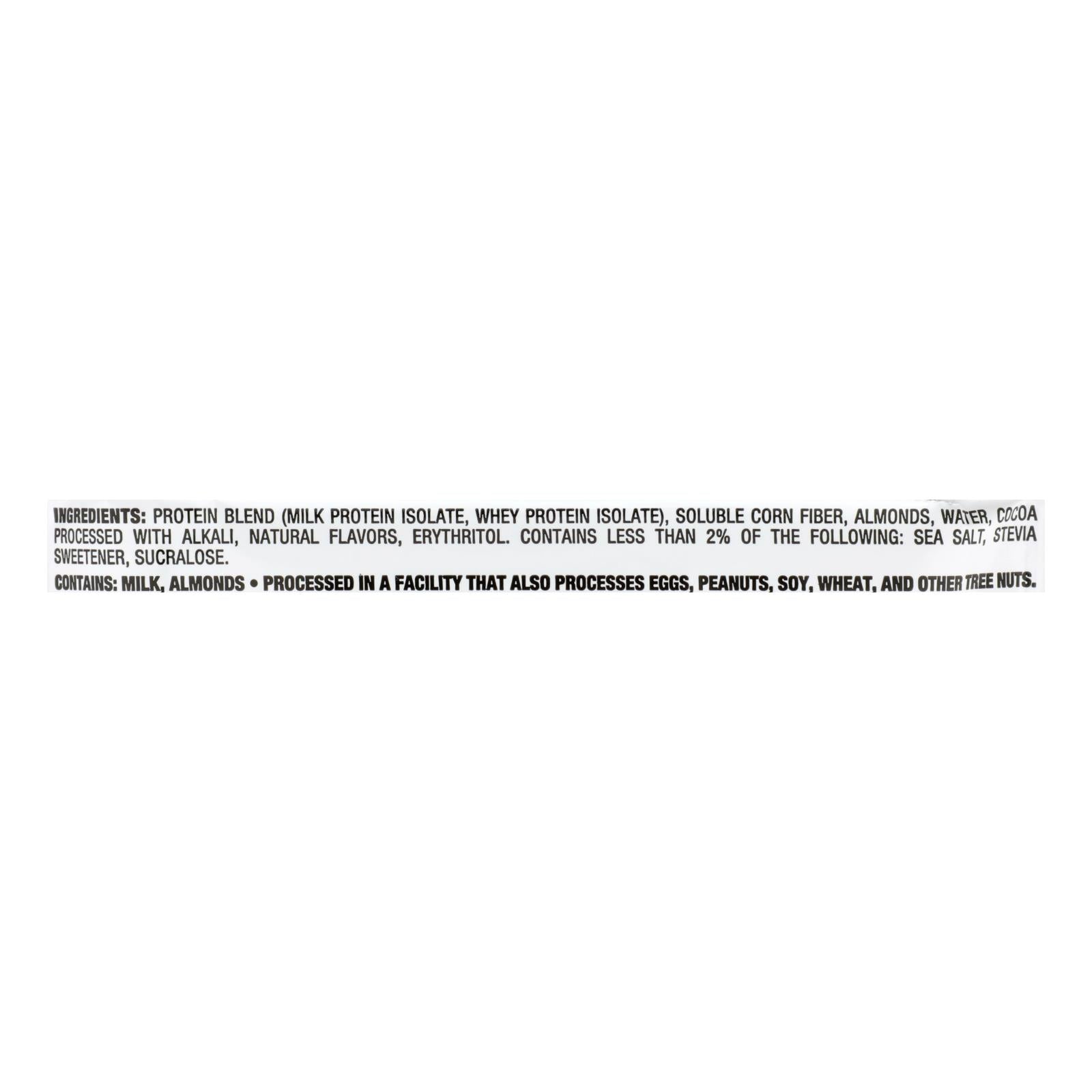 ingredients : protein blend;milk protein isolate;whey protein isolate;soluble corn fiber;almonds;water;cocoa processed with alkali;natural flavors;erythritol. Contains less than 2% of the following: sea salt;stevia sweetener;sucralose