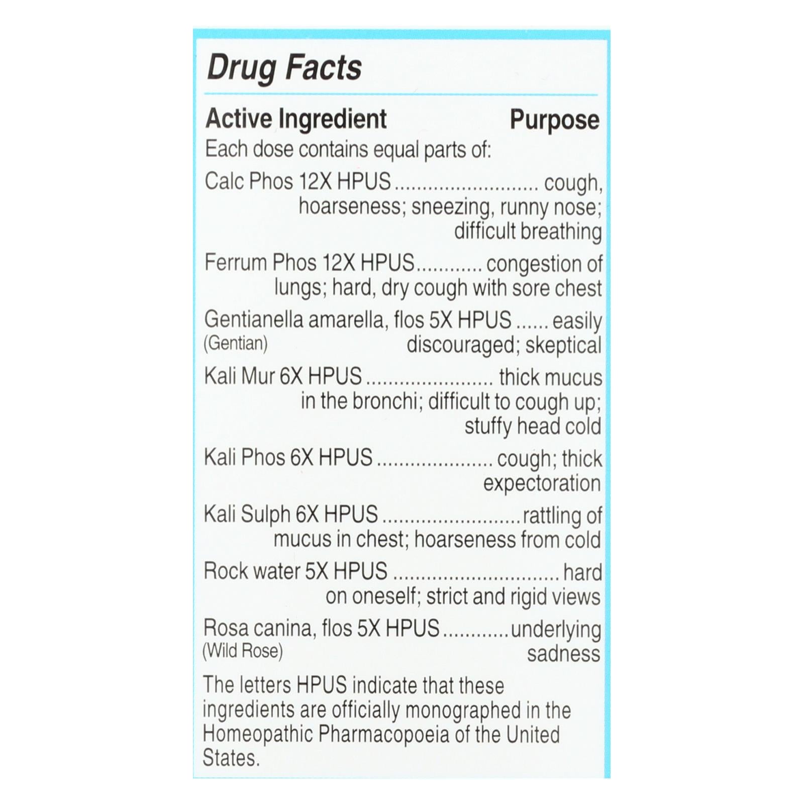 ingredients : drug facts;continued;inactive bittersweet;eucalyptus;jasmine;manzanita;milkweed;natural flavor;pleurisy root;purified and structured water;pussy's paw;rubber tree;drug facts active ingredient each dose contains equal parts of: calc phos 12x hpus purpose cough;hoarseness; sneezing;runny nose; difficult breathing ferrum phos 12x hpus purpose congestion of lungs; hard;dry cough with sore chest gentianella amarella;gentian;flos 5x hpus purpose easily discouraged; skeptical kali mur 6x hpus purpose