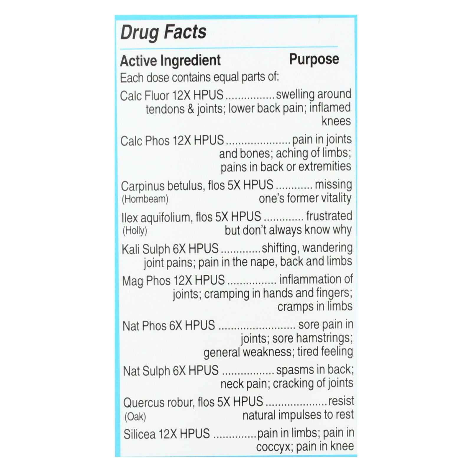 ingredients : calc flour 12x hpus ................ Swelling around tendons & joints; lower back pain; inflammed knees calc phos 12x hpus ................ Pain in joints and bones; aching of limbs; pains in back or extremities carpinus betulus;hornbeam;flos 5x hpus ................ Missing one's former vitaliy llex aquifolium;holly;flos 5x hpus ................ Frustrated but don't always know why kali suph 6x hpus ................ Shifting;wandering joint pains; pain in the nape;back and limbs mag phos 1