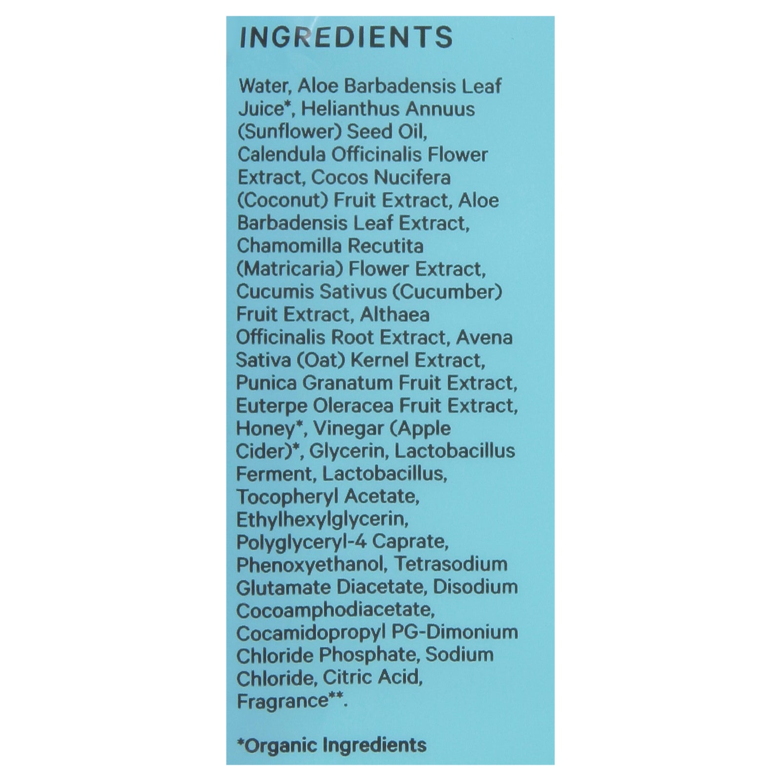 ingredients : water;aloe barbadensis leaf juice;helianthus annuus (sunflower) seed oil;calendula officinalis flower extract;cocos nucifera (coconut) fruit extract;aloe barbadensis leaf extract;chamomilla recutita (matricaria) flower extract;cucumis sativus (cucumber) fruit extract;althaea officinalis root extract;avena sativa (oat) kernel extract;punica granatum fruit extract;euterpe oleracea fruit extract;honey;vinegar (apple cider);glycerin;lactobacillus ferment;lactobacillus;tocopheryl acetate;ethylhexylgl