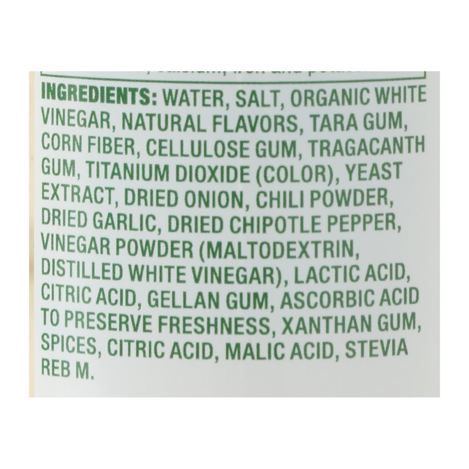 ingredients : water;salt;white distilled vinegar;cellulose gel;corn fiber;xanthan gum;natural flavors;titanium dioxide (color);propylene glycol alginate (algae extract);yeast extract;dried onion;chili powder;dried garlic;sodium citrate;dried chipotle pepper ;lactic acid;gellan gum;citric acid;vitamin c (ascorbic acid) to preserve freshness;spices;stevia leaf extract