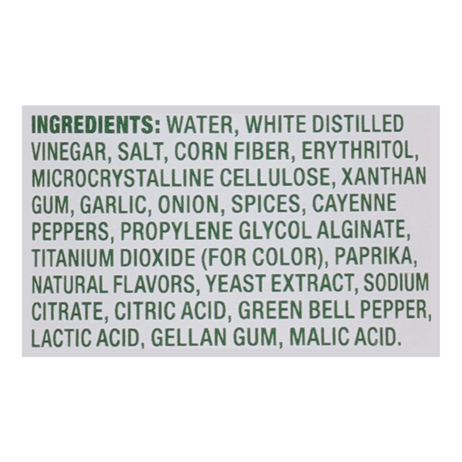 ingredients : water;white distilled vinegar;salt;corn fiber;erythritol;microcrystalline cellulose;xanthan gum;garlic;onion;spices;cayenne peppers;propylene glycol alginate;titanium dioxide (for color);paprika;natural flavors;yeast extract;sodium citrate;citric acid;green bell pepper;lactic acid;gellan gum;malic acid