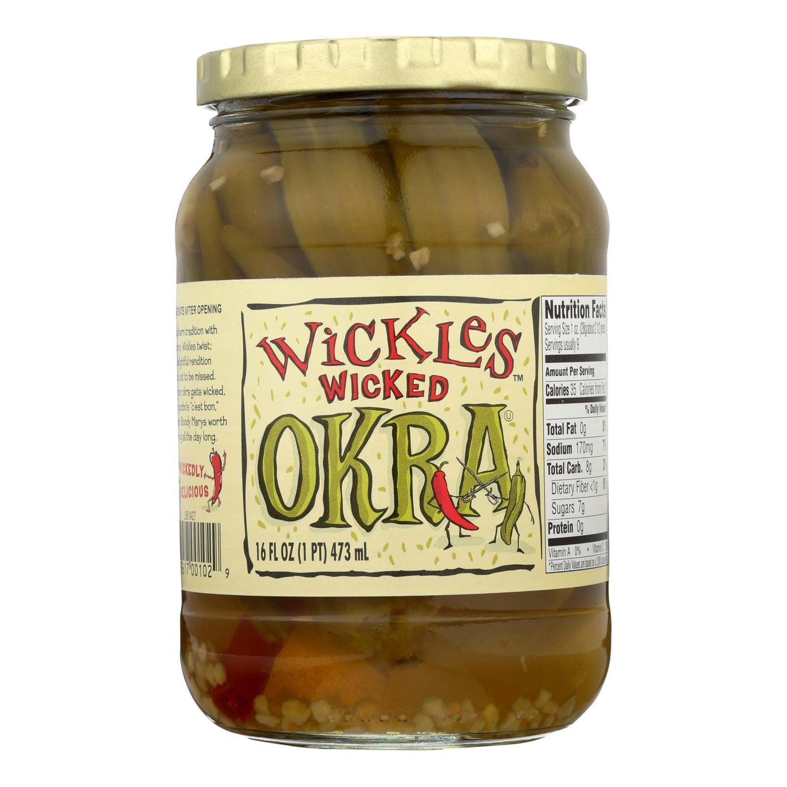 Wickles wicked okra make a delicious addition to your cocktails, hors d'oeuvres and buffets. Spice up your parties or serve our spicy pickled okra anytime at meals and snack time. Our recipe starts with delicious fresh okra, water and vinegar. We add some zing with garlic and red chili peppers, and wrap it all up in 35 calories per serving. This 16 fl. Oz. Jar of wicked okra contains about nine 1 oz. Servings.