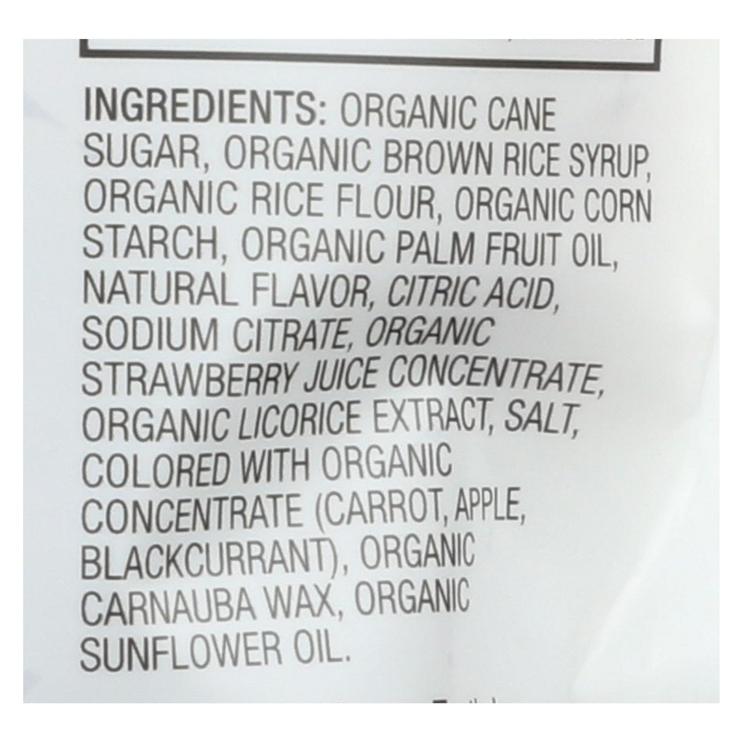 ingredients : organic cane sugar;organic rice syrup;organic rice flour;organic tapioca starch;organic sunflower oil;natural flavor;citric acid;sodium citrate;organic strawberry juice concentrate;organic licorice root powder;organic carnauba wax;colored with organic concentrates (carrot, apple, blackcurrant);salt